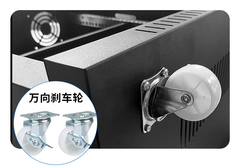 機柜配有靜音萬向輪,承重力強,含2個剎車輪,整體更穩定360°移動無死角